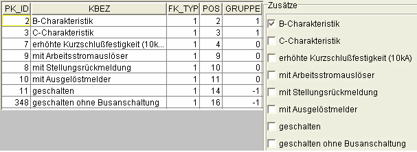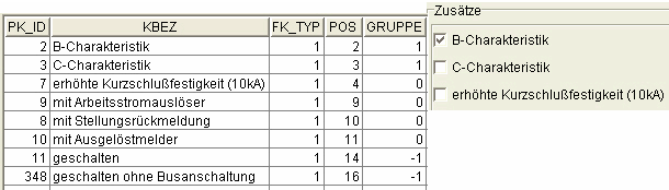 - Zusätze, innerhalb eines Schaltungstyps (Spalte "FK_Typ"), die mit Ziffer "0" gekennzeichnet sind werden nicht gruppiert, d.h. ohne Bedingung auswählbar (Bild 3 "PK_ID" 7, 8, 9, 10).