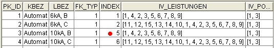 - Mit einer negativen Zahl, innerhalb eines Schaltungstyps (Spalte "FK_Typ"), werden die Zusätze, die Leistungsabhängig sind, gekennzeichnet. D.h. bei Änderung der Leistung einer Einspeisung müssen auch bestimmte Zusätze (z. B. Strommessung) Leistungsabhängig angepasst werden (Bild.4 "PK_ID" 11 und 348).