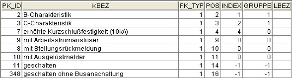 - Zusätze, innerhalb eines Schaltungstyps (Spalte "FK_Typ"), mit gleicher negativer Zahl werden gruppiert und können über eine "ODER" Logik ausgewählt werden, sind aber im Grundzustand mit "0" definiert, d.h. nicht ausgewählt. Mehrere Gruppen, innerhalb eines "FK_Typs", müssen mit unterschiedlichen negativen Zahlen gekennzeichnet werden (Bild 3 "PK_ID" 11, 348).