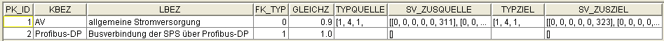- Die Spalte "PK_ID" (Produktkennzeichnung_Identifizierung) liefert den Verbindungstyp der in der Spalte "FK_TYP" hinterlegten Nummer, der Tabelle "ProjxVerb", entspricht. Sie wird zur internen Zeilennummerierung verwendet und programmtechnisch erzeugt.