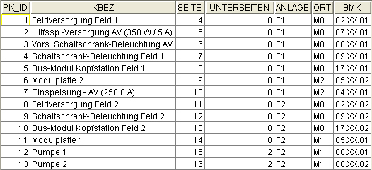 In der Tabelle "ProjxVertxCont" werden die durch das System erzeugten Seiten, Unterseiten, Anlage, Ort und Betriebsmittelkennzeichnungen der Submodule abgelegt und an die Stromlaufplangenerierung übergeben.